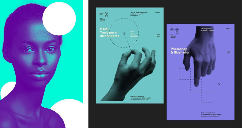Using a more limited colour palette of duotone or monochrome colour schemes this year, is a design trend that looks set to re-emerge. Single or duo colour designs can have a lot of impact, as seen by these examples below. They can create a calmer, more relaxed, smoother feel and allow designers to be more abstract and experimental in their compositions because of the endless techniques and filters they have open to them.