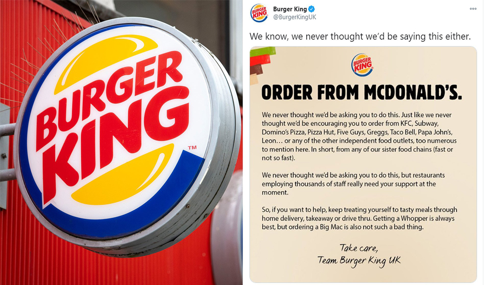 In this most surprising turn of events, leading fast-food giant Burger King not only encouraged customers to order from arch rivals McDonald’s in their campaign, but also gave the badly-suffering restaurant industry a much-needed shout out.