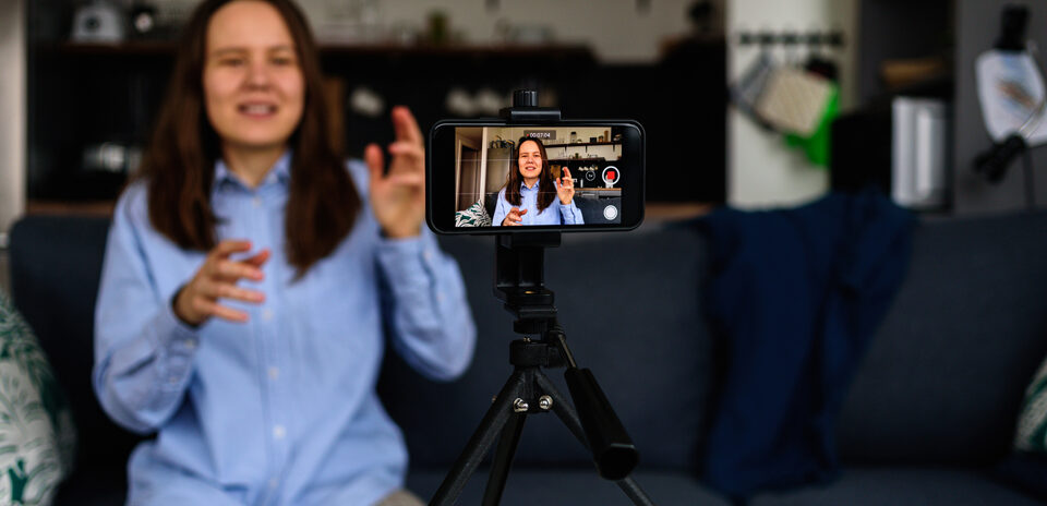 If you need to use lights, then try moving them around and pointing them away from you and ‘bounce’ the light off a piece of white card or a wall so the shadows are eliminated or softened. If you plan to film a lot from home, then investing in a Ring Light can help. This illuminates you with a flattering soft, clean light.